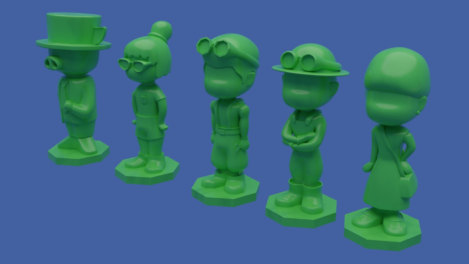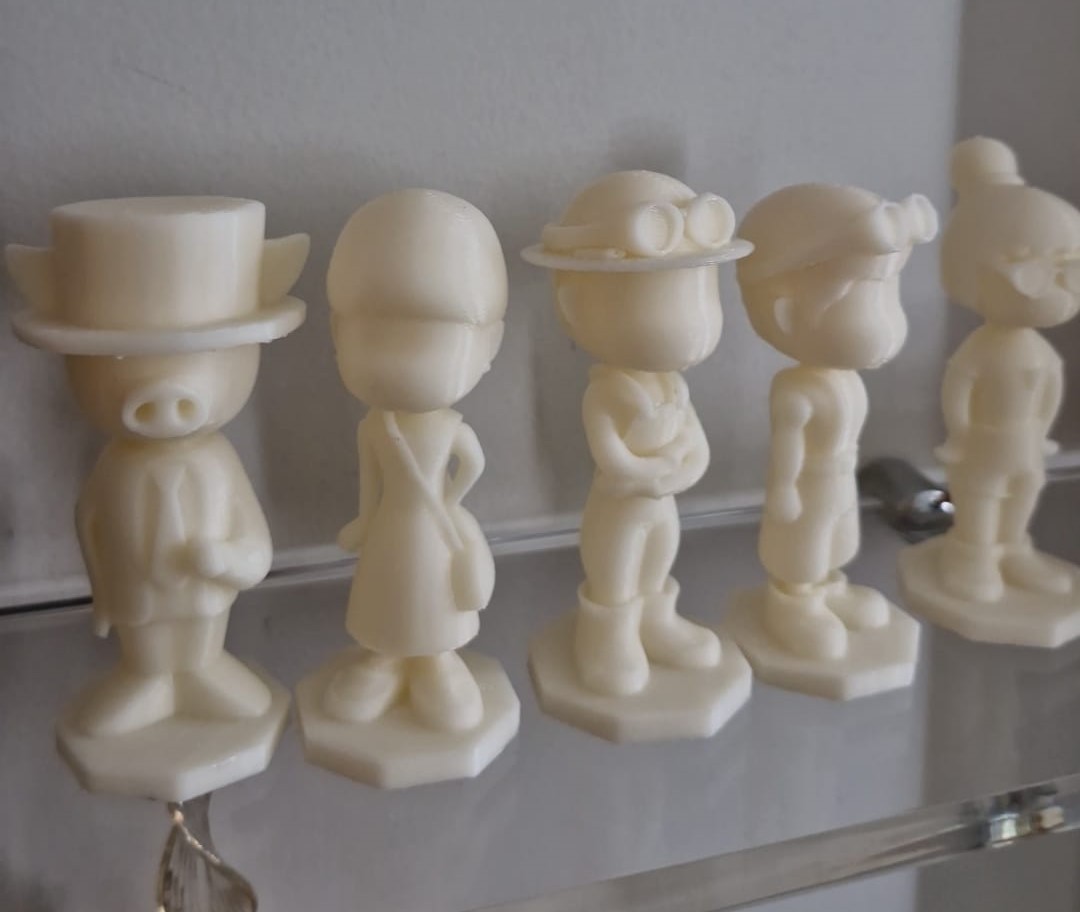 Também sou game designer e artista de jogos. Estou criando um jogo de tabuleiro como parte de um projeto e dentro do jogo ao invés de peões, os jogadores jogam com personagens. Criei todos eles a partir de inputs dados por jogadores em workshops, depois os modelei no Blender e imprimi em 3D!